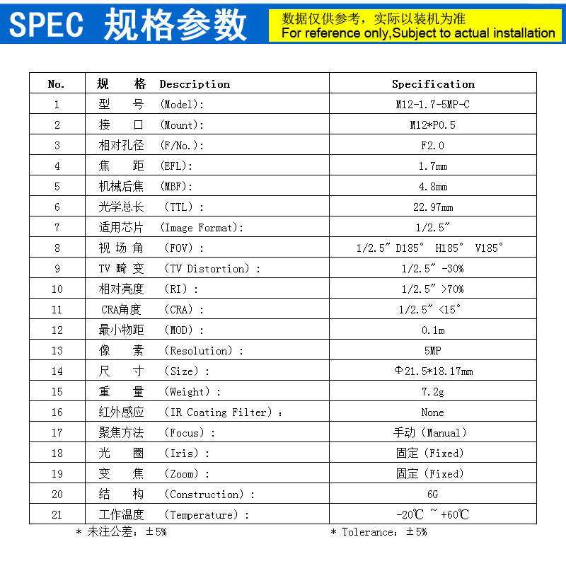 视场角 (FOV): 1/2.5" D185° H185° V185°