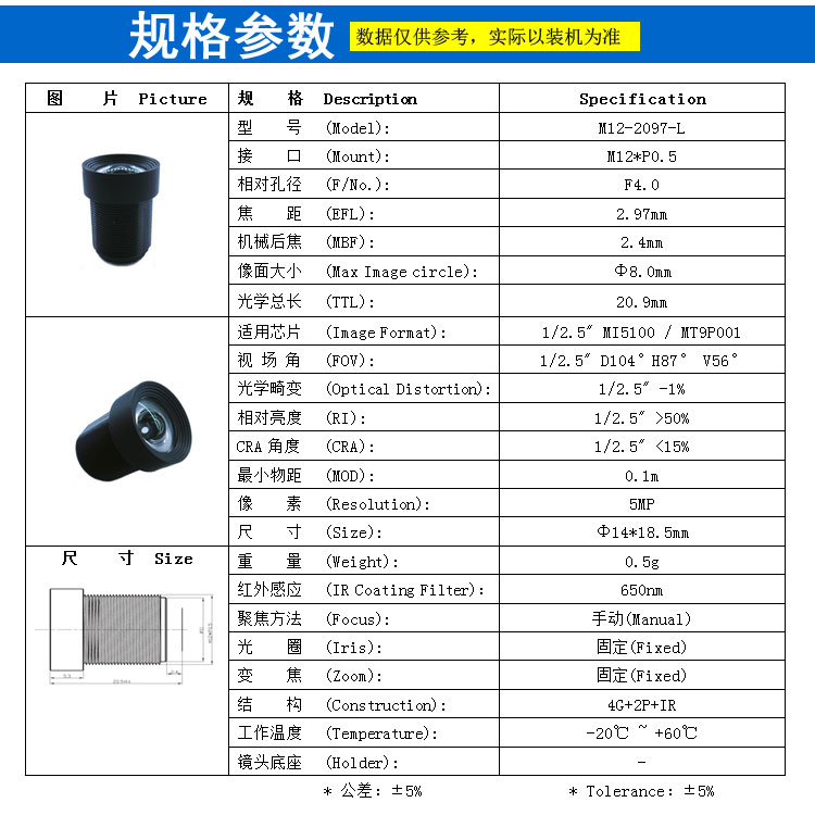 适用芯片 (Image Format): 1/2.5" MI5100 / MT9P001