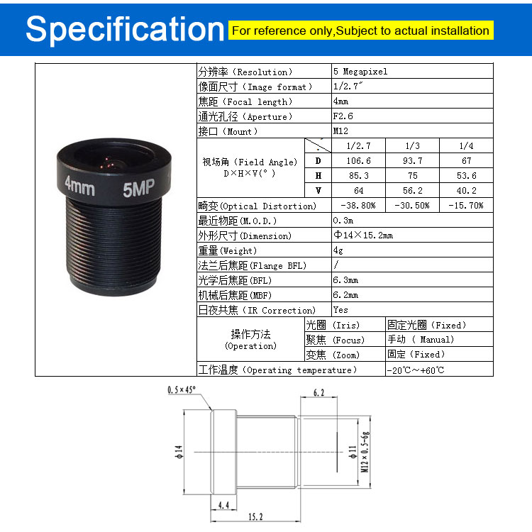 【一】要确定您现有的摄像机的感光芯片CMOS是什么尺寸的,例如:1/4”,即1/4英寸,代表感光芯片对角线尺寸为1/4英寸;