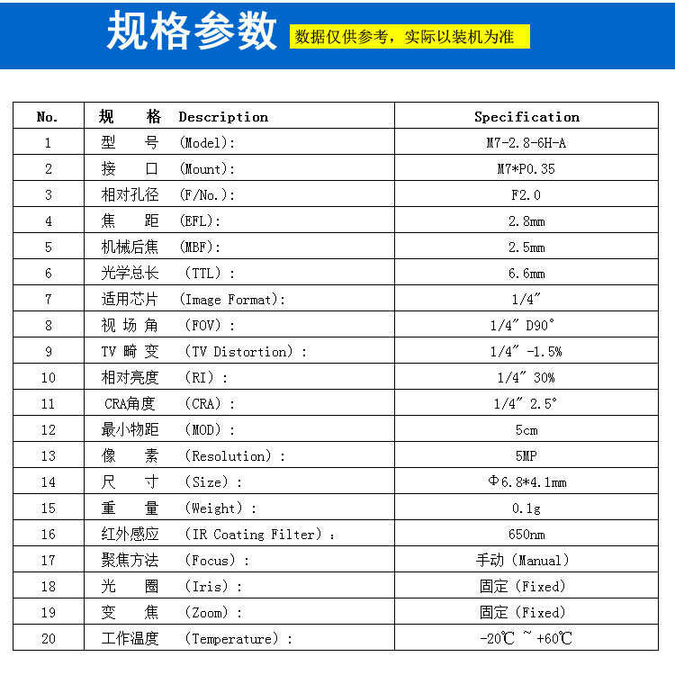 例如,M7*P0.35,其中M7代表螺纹直径在7mm左右,称为M7镜头,常见的直径一般为6.8mm左右