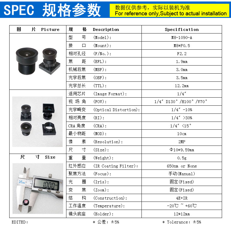 视场角 (FOV): 1/4" D130°/H100°/V70°