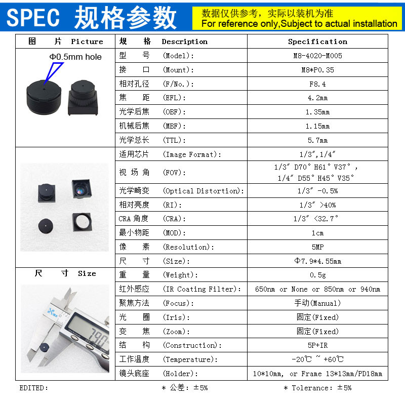 光学畸变 (Optical Distortion): 1/3" -0.5%
