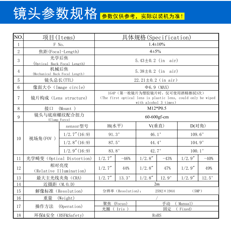 【一】要确定您现有的摄像机的感光芯片CMOS是什么尺寸的,例如:1/4”,即1/4英寸,代表感光芯片对角线尺寸为1/4英寸;