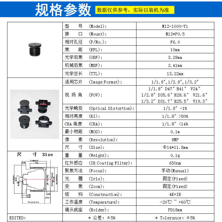 适用芯片 (Image Format): 1/1.8",1/2.8",1/3.2"
