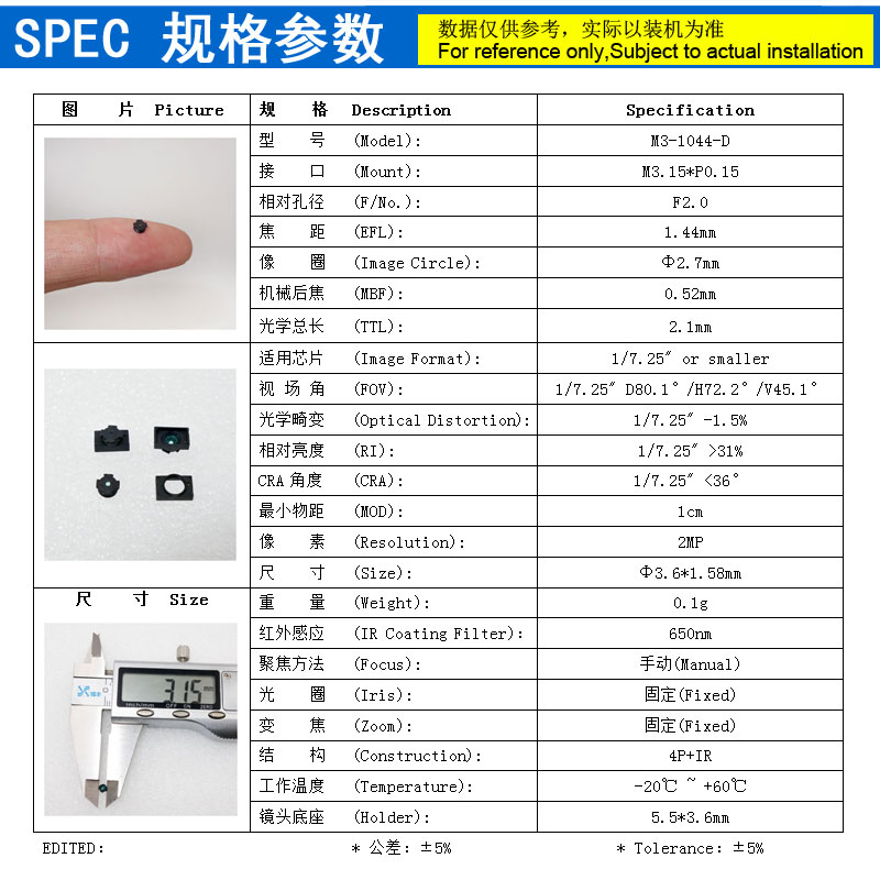 视场角 (FOV): 1/7.25" D80.1°/H72.2°/V45.1°