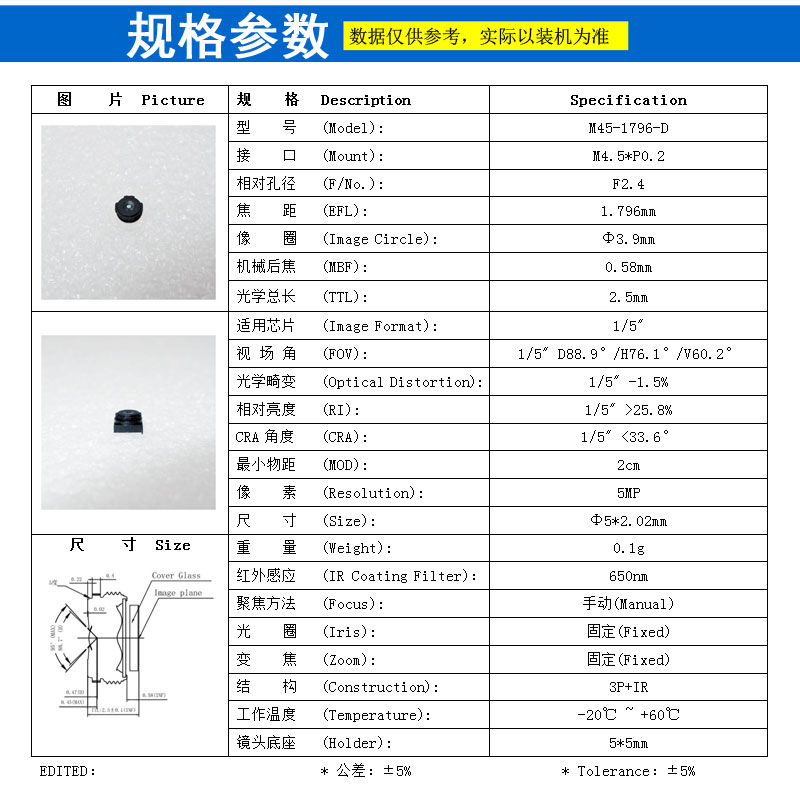 视场角 (FOV): 1/5" D88.9°/H76.1°/V60.2°