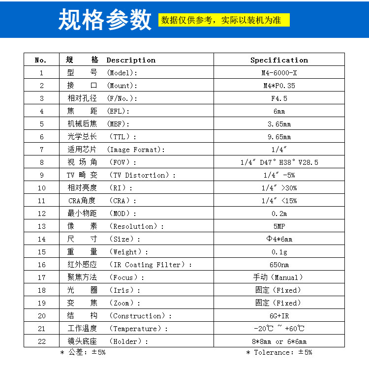 焦距 (EFL): 6mm