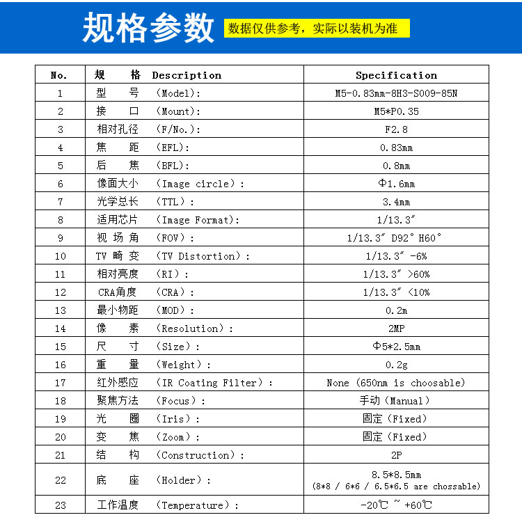 像面大小 (Image circle): Φ1.6mm
