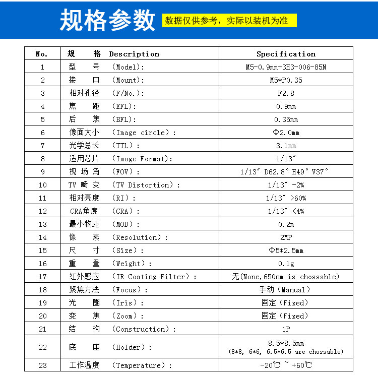 像面大小 (Image circle): Φ2.0mm