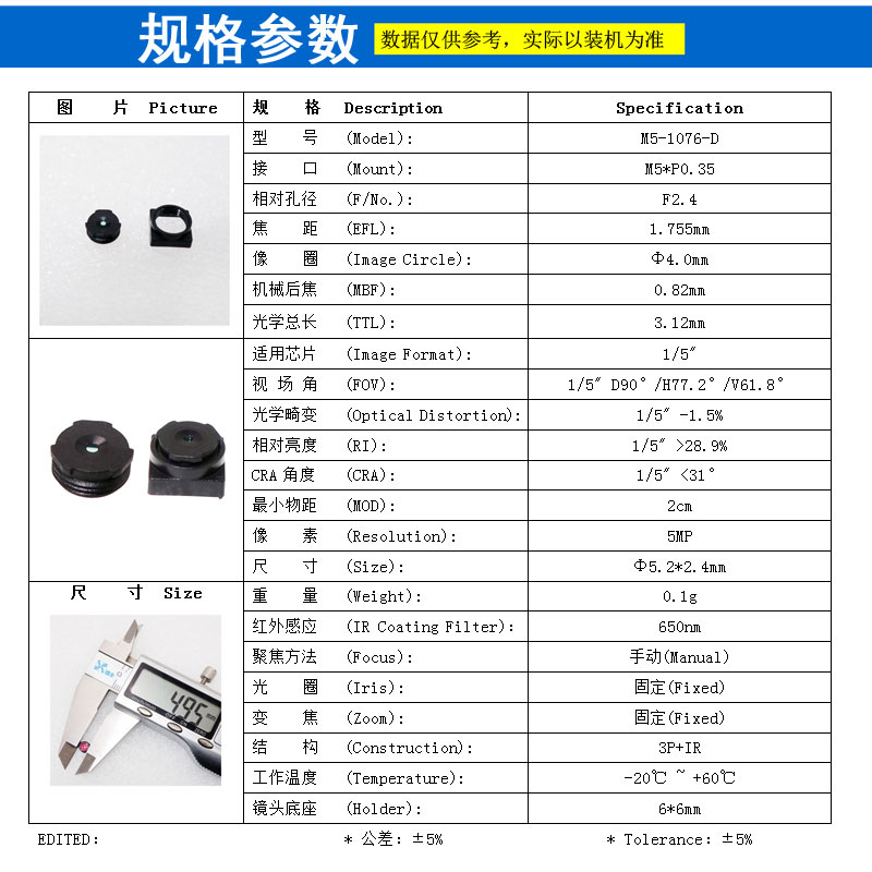 视场角 (FOV): 1/5" D90°/H77.2°/V61.8°