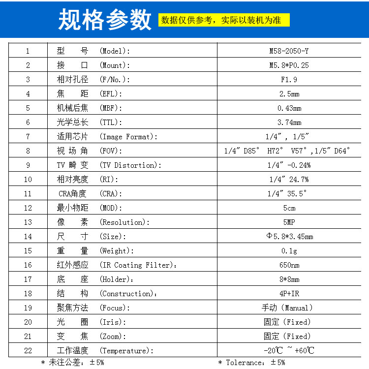 视场角 (FOV): 1/4" D85° H72° V57°,1/5" D64°