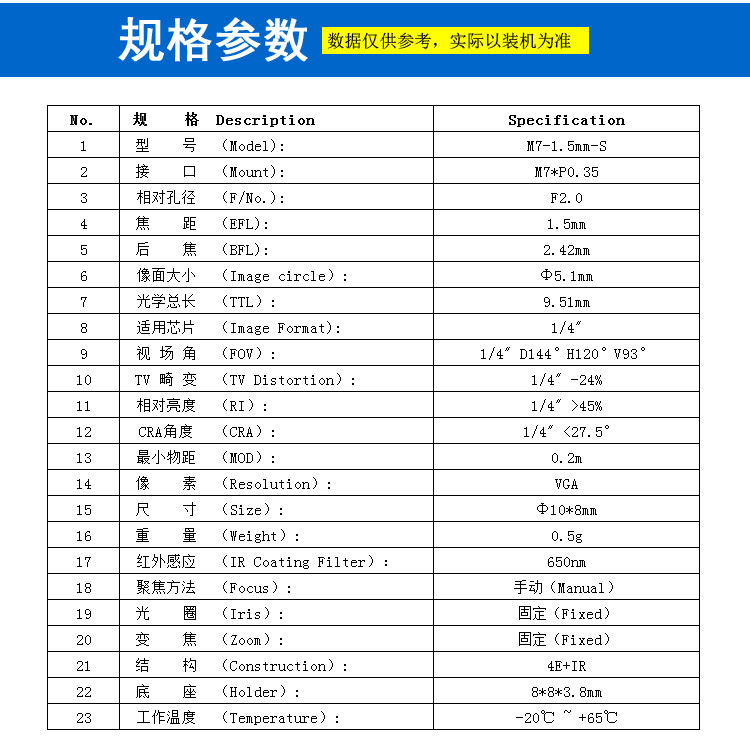 例如,M7*P0.35,其中M7代表螺纹直径在7mm左右,称为M7镜头,常见的直径一般为6.8mm左右