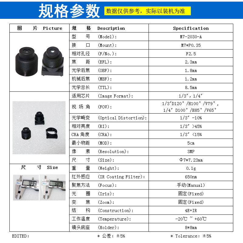 例如,M7*P0.35,其中M7代表螺纹直径在7mm左右,称为M7镜头,常见的直径一般为6.8mm左右