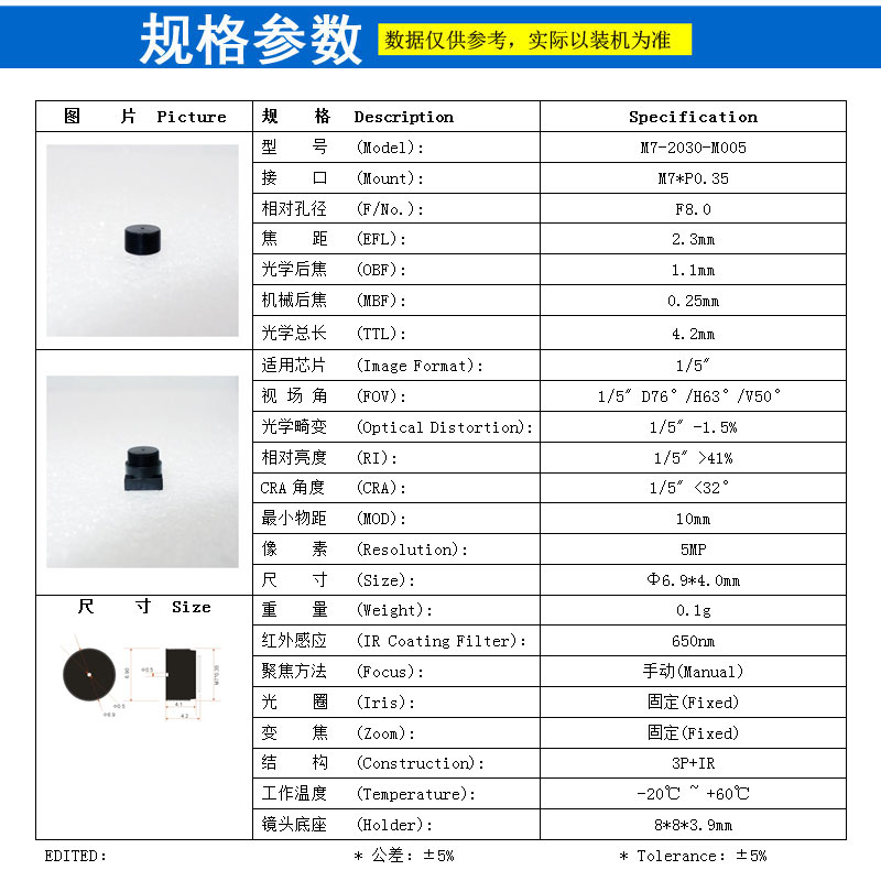 适用芯片 (Image Format): 1/5"