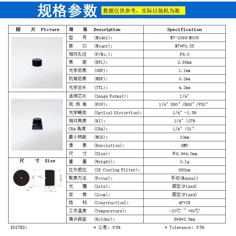 适用芯片 (Image Format): 1/4"