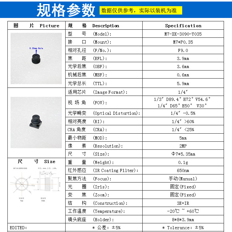 焦距 (EFL): 3.9mm
