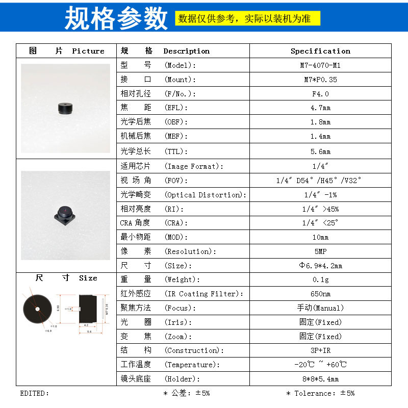 例如,M7*P0.35,其中M7代表螺纹直径在7mm左右,称为M7镜头,常见的直径一般为6.8mm左右