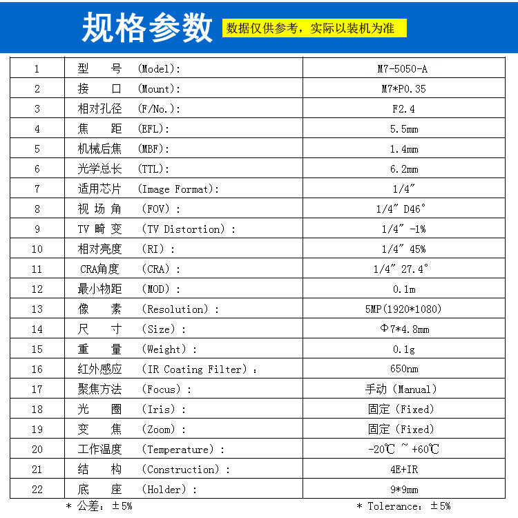 像素 (Resolution): 5MP(1920*1080)