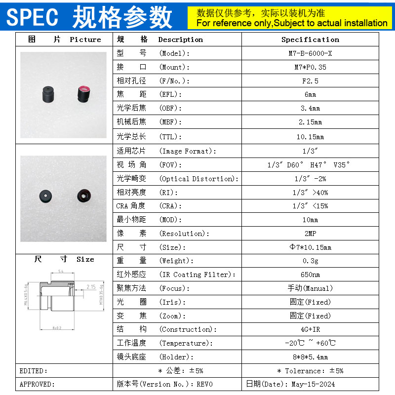 例如,M7*P0.35,其中M7代表螺纹直径在7mm左右,称为M7镜头,常见的直径一般为6.8mm左右