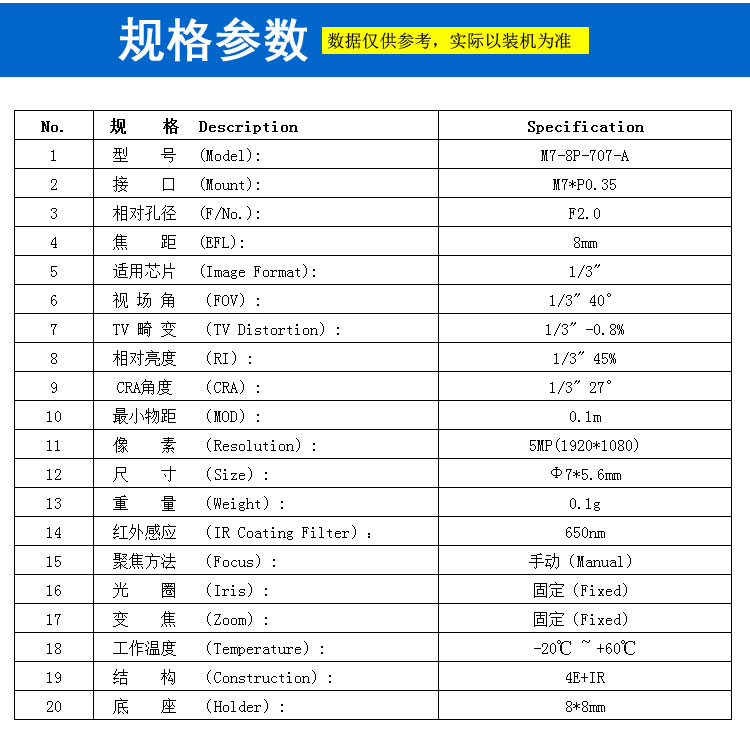 焦距 (EFL): 8mm