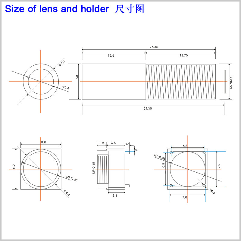 例如,M7*P0.35,其中M7代表螺纹直径在7mm左右,称为M7镜头,常见的直径一般为6.8mm左右