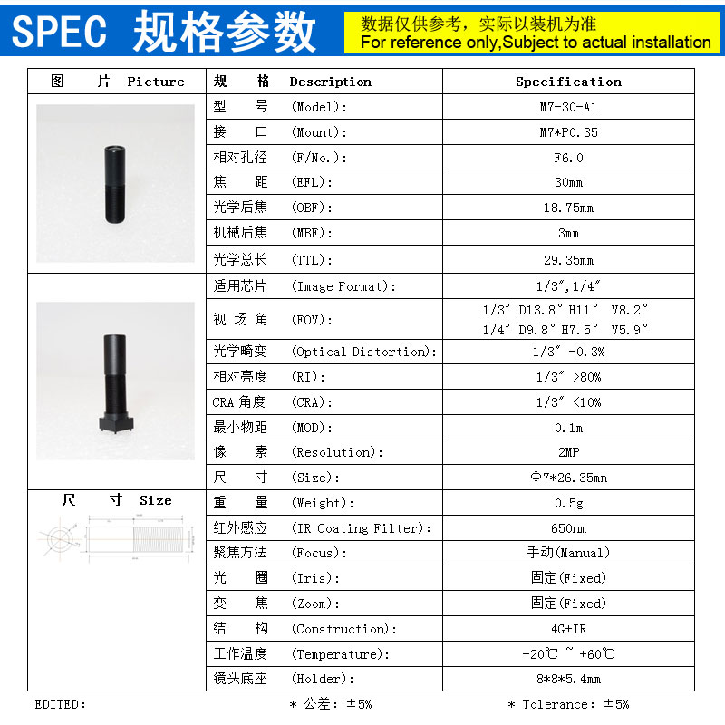 焦距 (EFL): 30mm
