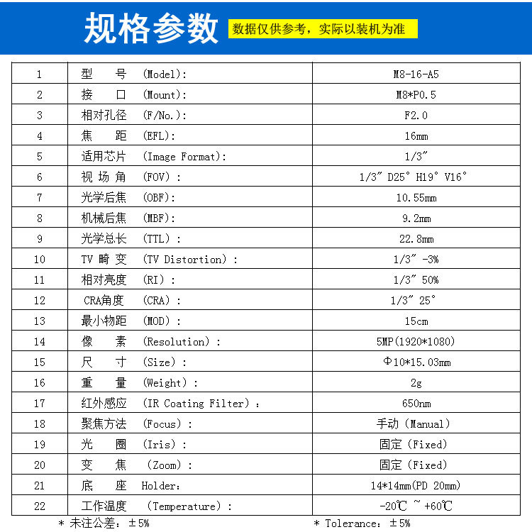 16mm长焦距 M8*0.35接口小型镜头 小角度高清放大镜头 500万像素