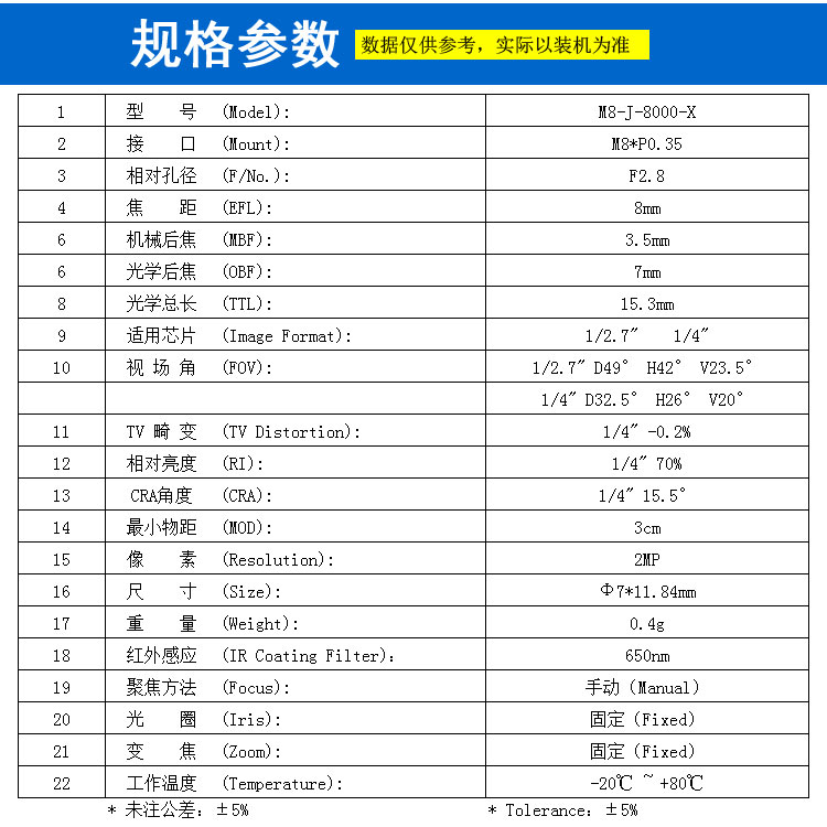 适用芯片 (Image Format): 1/2.7" 1/4"