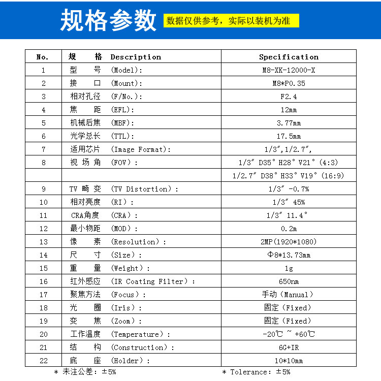 适用芯片 (Image Format): 1/3",1/2.7",