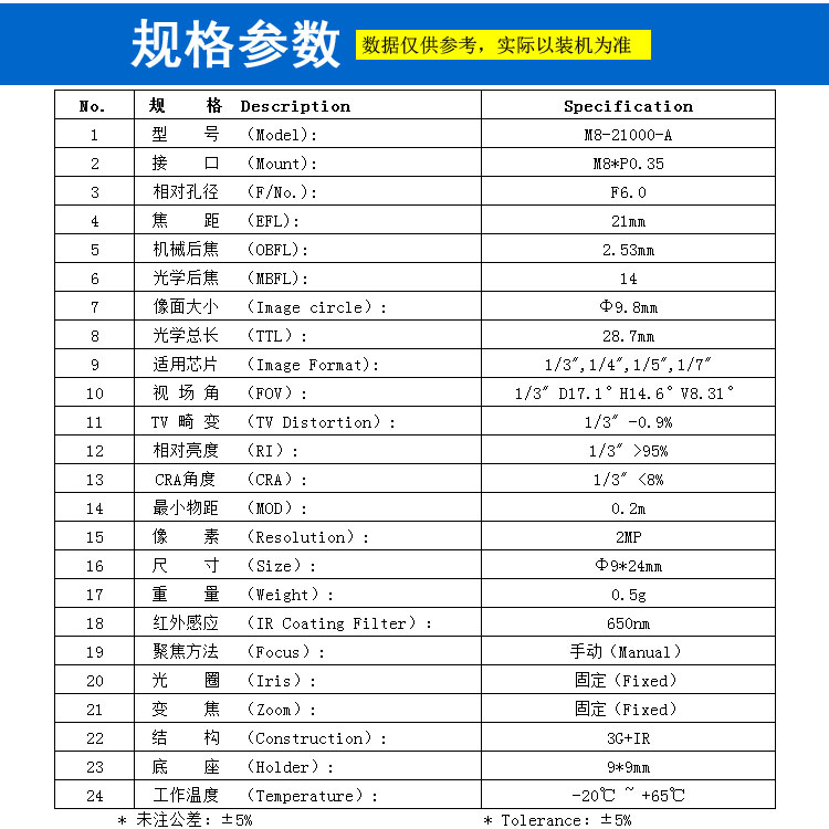 适用芯片 (Image Format): 1/3",1/4",1/5",1/7"